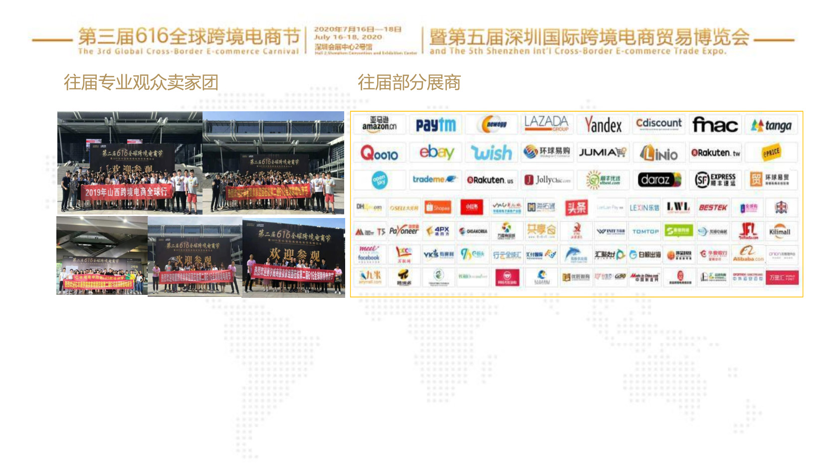 協(xié)辦單位:廣東省跨境電子商務(wù)協(xié)會、廣州市跨境電商協(xié)會、 中山市跨境電子商務(wù)協(xié)會、 東莞市跨境電子商務(wù)協(xié)會、佛山市跨境電子商務(wù)協(xié)會、 汕頭市跨境電子商務(wù)協(xié)會、 惠州市電子商務(wù)協(xié)會、廣東省供應(yīng)鏈管理協(xié)會、廣東省網(wǎng)商協(xié)會、廣東省采購與供應(yīng)鏈協(xié)會、寧波市跨境電子商務(wù)協(xié)會、杭州跨境電子商務(wù)協(xié)會、義烏市跨境電商協(xié)會、成都市跨境電子商務(wù)協(xié)會、南京跨境電子商務(wù)行業(yè)協(xié)會、 廈門市跨境電子商務(wù)協(xié)會、 泉州市跨境電子商務(wù)協(xié)會、 福州市電子商務(wù)行業(yè)協(xié)會、大連市跨境電子商務(wù)協(xié)會、 青島市跨境電子商務(wù)協(xié)會、 威海市跨境電子商務(wù)協(xié)會、山西省跨境電子商務(wù)協(xié)會、湖南省跨境電子商務(wù)協(xié)會海外分會:美國分會、澳大利亞分會、韓國分會、日本分會、俄羅斯分會、越南分會、阿聯(lián)酋迪拜