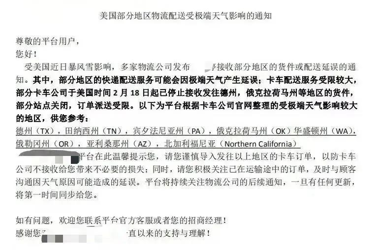 2021年新年剛過,美國那邊暴風(fēng)雪襲來不少地區(qū)停水停電,以美國德州地區(qū)最為嚴(yán)重。還給交通帶來了非常糟糕的情況,這些大雪封路的地區(qū)無論是FBA頭程尾端部分還是FBA部分都會(huì)有1-3周的延遲。