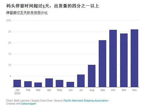 洛杉磯、長灘港口情況嚴(yán)峻,新的一年并沒有太大的改觀。依然是擁堵嚴(yán)重,新冠感染人數(shù)的上升和陸地運(yùn)輸?shù)难舆t,讓港口貨物堆積越來越多,增加了集裝箱船卸貨的進(jìn)度。很多國內(nèi)過來的集裝箱船都無法靠港卸貨,相關(guān)人士預(yù)計(jì)普船靠港卸貨時(shí)間預(yù)計(jì)需要一到兩周的時(shí)間。