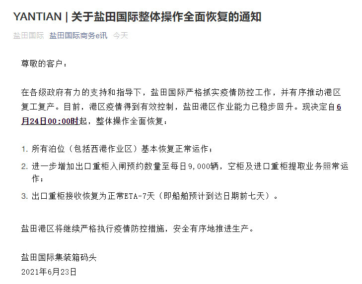 目前,港區(qū)疫情得到有效控制,鹽田港區(qū)作業(yè)能力已穩(wěn)步回升。鹽田國際發(fā)布最新通知。
