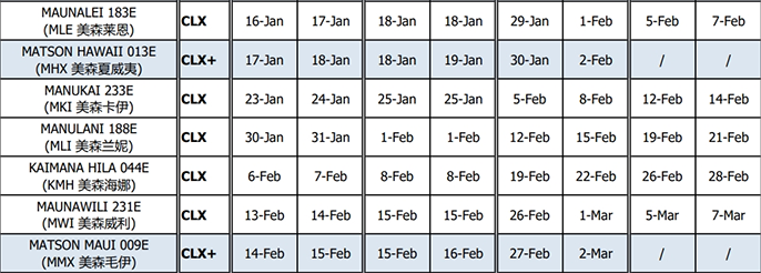 目前已知的電商快船航線就有不少通知停航,比如美森的CLX+、以星ZEX航線已發(fā)出通知停航三周。美森正班船航線CLX目前是不停航的。美森加班船航線CLX+在1月22、29日和2月5日這三個開船日停航。