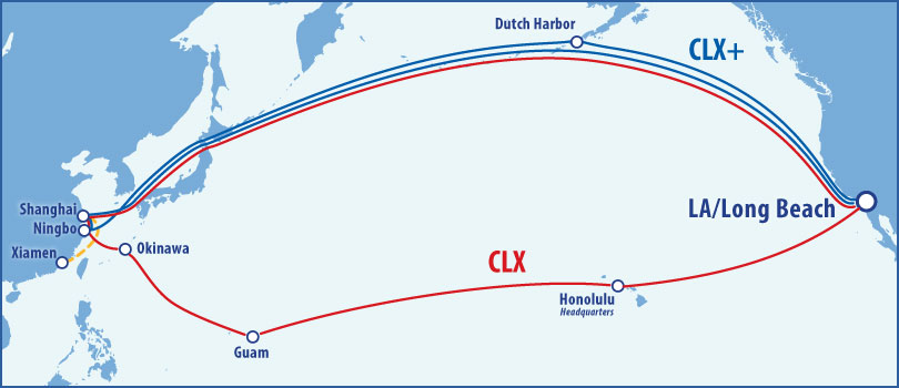 正班CLX航線的里有兩個部分,寧波-上海-長灘這部分是國內(nèi)到美西的航線,長灘-火奴魯魯-關(guān)島是美國國內(nèi)航線:美西-夏威夷-關(guān)島的美國國內(nèi)物資運輸。
